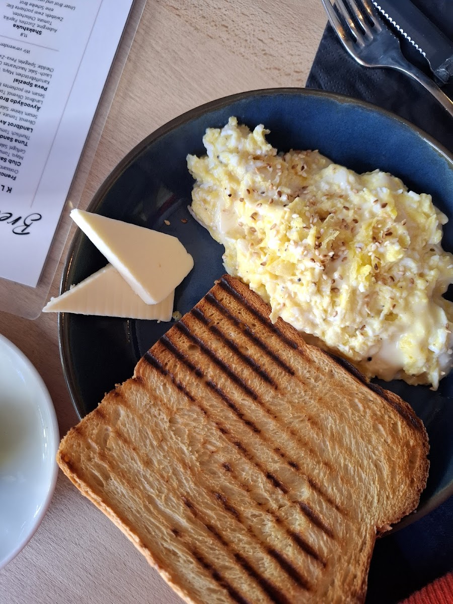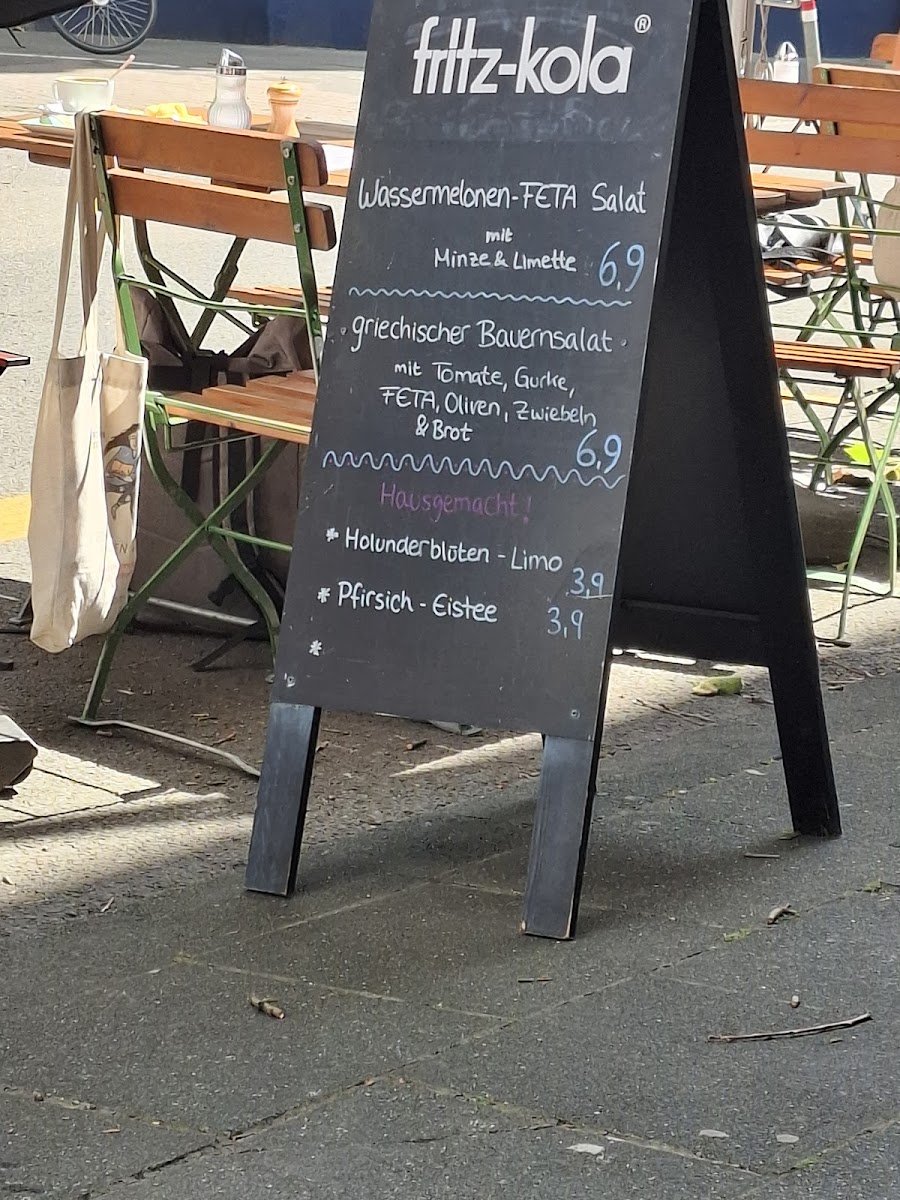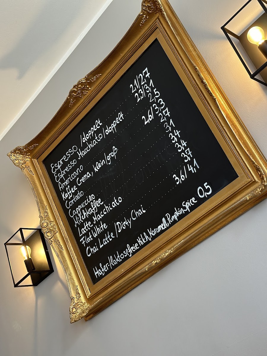 The menu features a selection of food and beverages suitable for breakfast, brunch, and casual dining. Visitors can choose from a range of coffee and tea options, including specialty coffee drinks such as Flat White and Kaffee Crema Groß. The food offerings include classic breakfast dishes like Eggs Benedict with variations such as Peva Zwiebeln and salmon, as well as egg-based meals like Rührei with salmon and Strammer Max.
